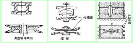 精密鑄件形狀為兩端截面大、中間截面小、如帶輪、槽輪、車床四方刀架等,為保證順利起模,應采用三箱分模造型。此時分模面應模樣的小截面處,而分型面仍選在鑄件兩端的大截面處,由于三箱造型有兩個分型面,降低了鑄件高度方向的尺寸精度,增加了分型面處飛邊毛刺的清整理工作量,操作較復雜,生產較低,不適用于機器造型,因此,三箱造型僅用于形狀復雜、不能用兩箱造型的鑄件生產。